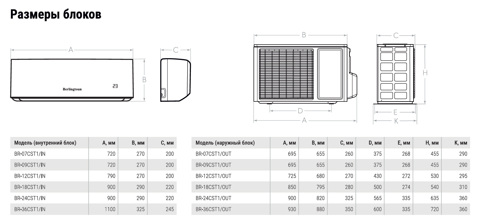 Габаритные размеры внутреннего блока, мм