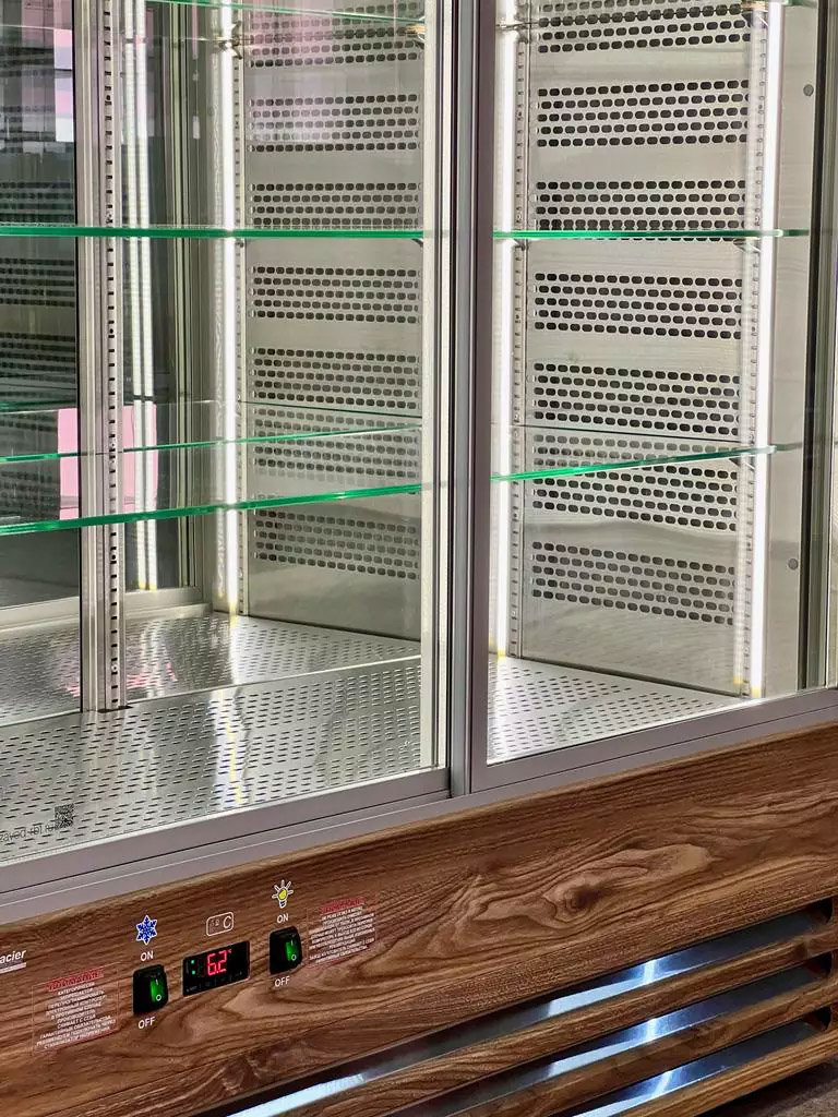 Экспозиция: 4 полки, регулируемые по высоте плюс пятая - нижняя выкладка из нержавеющей стали.